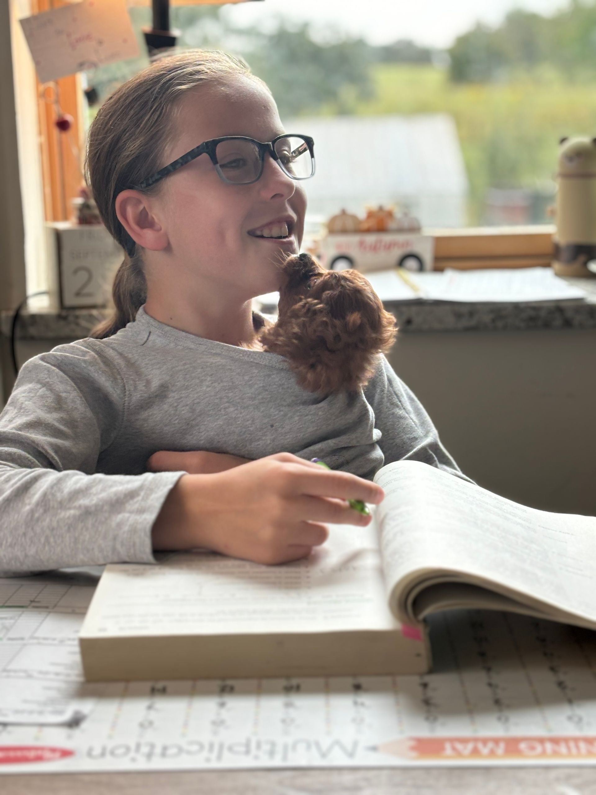 Abigail has her Pupperchief business sewing puppy bandanas.