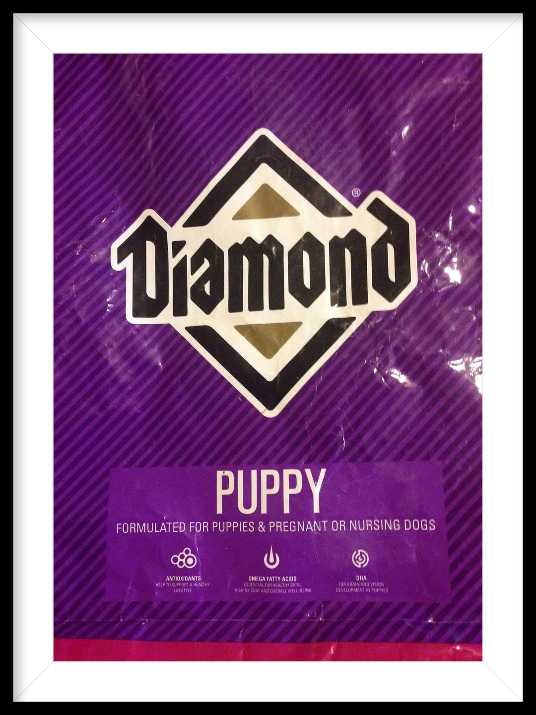 We have been feeding your puppy free choice with Diamond Puppy food in the Purple sack.